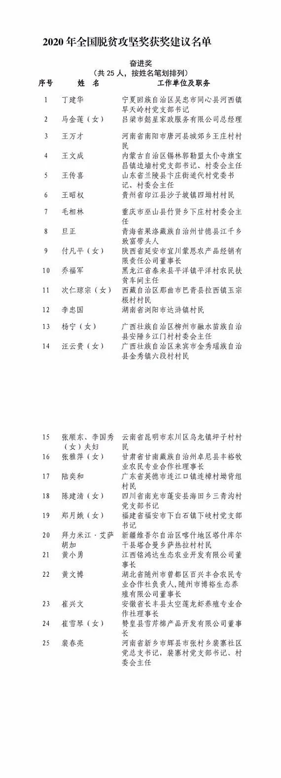 2020年全國脫貧攻堅獎獲獎建議名單公示