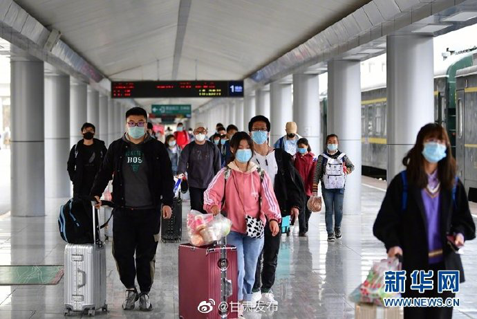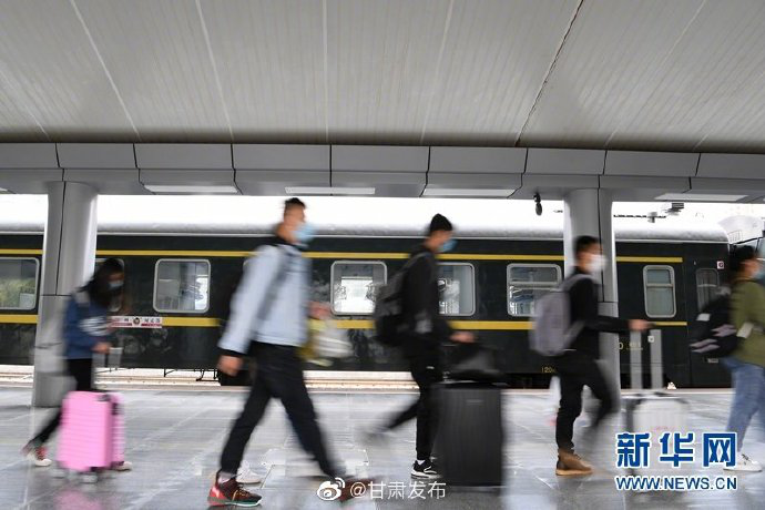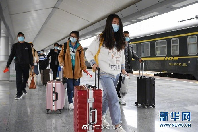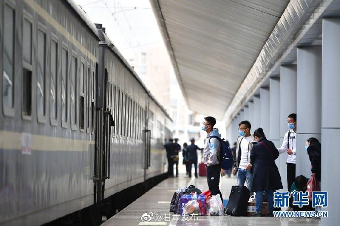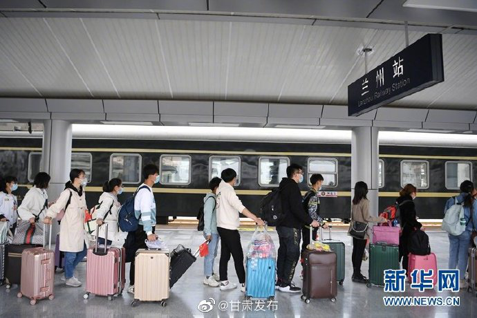 抓好防控復工復產【甘肅開行多趟“點對點”專列助力學生返校復學】4月17日,塔里木大學的學生準備從蘭州火車站登上學生專列出發。當日,中國鐵路蘭州局集團有限公司又一趟“點對點”學生專列K4097次列車開行,運送蘭州、武威、張掖、酒泉等地的學生前往新疆阿克蘇返校復學。(新華社記者 陳斌 攝)
