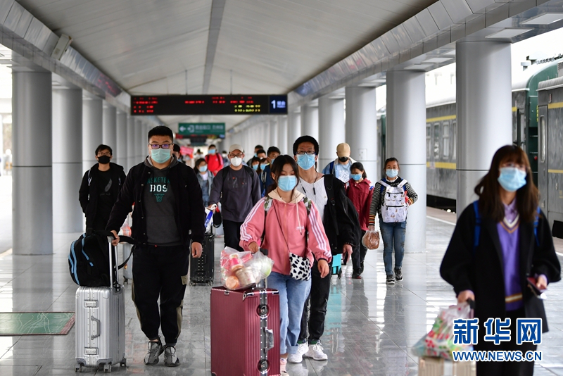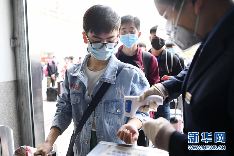 4月17日,塔里木大學的學生在蘭州火車站進站口測溫后進站。新華社記者 陳斌 攝