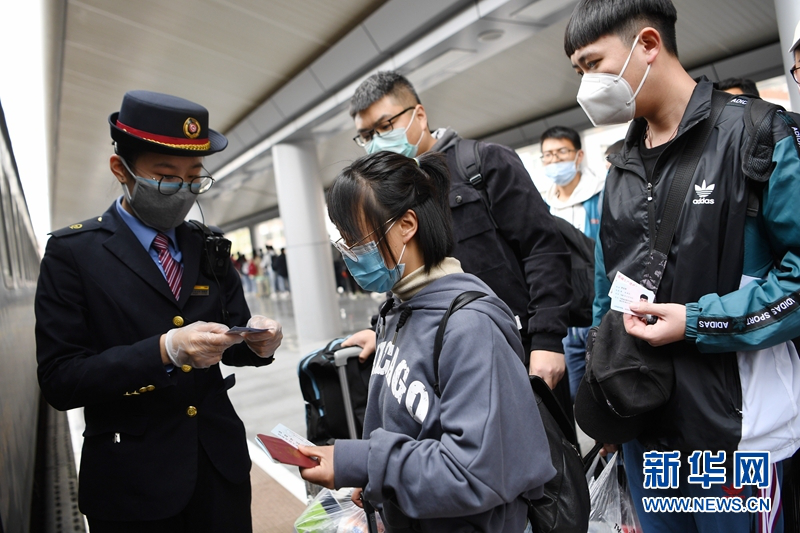 4月17日,塔里木大學的學生準備從蘭州火車站登上學生專列出發。新華社記者 陳斌 攝