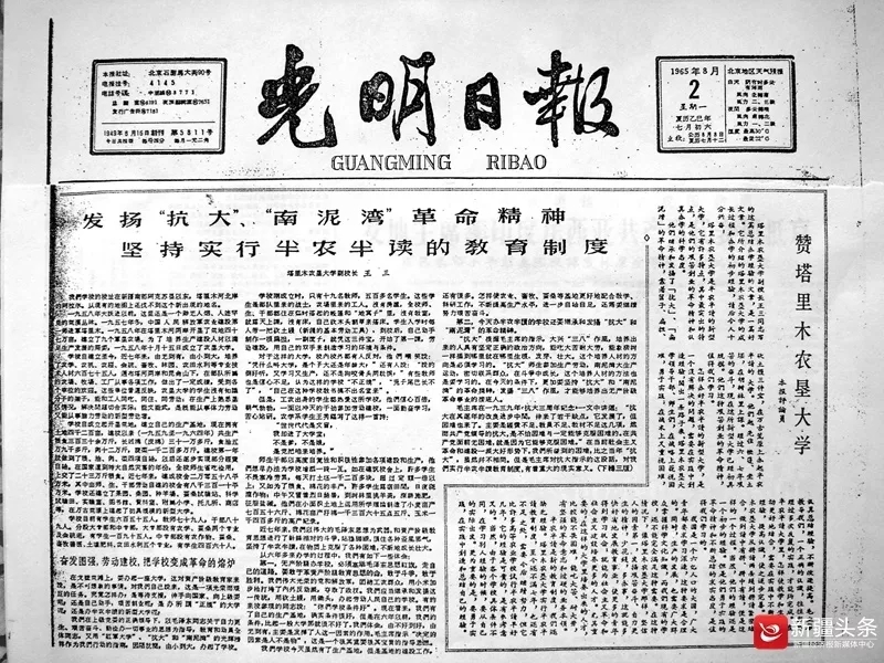 1965年8月2日,《光明日報》發表文章:《發揚“抗大”、“南泥灣”革命精神 堅持實行半農半讀的教育制度》