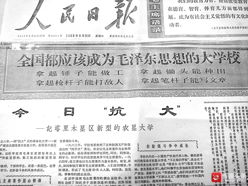 1966年9月14日,《人民日報》發表文章《今日“抗大”——記塔里木墾區新型的農墾大學》,對學校在創辦過程中,堅持艱苦創業、勤儉辦校、發揚“抗大”作風和“南泥灣”精神取得的成果給予了高度評價。