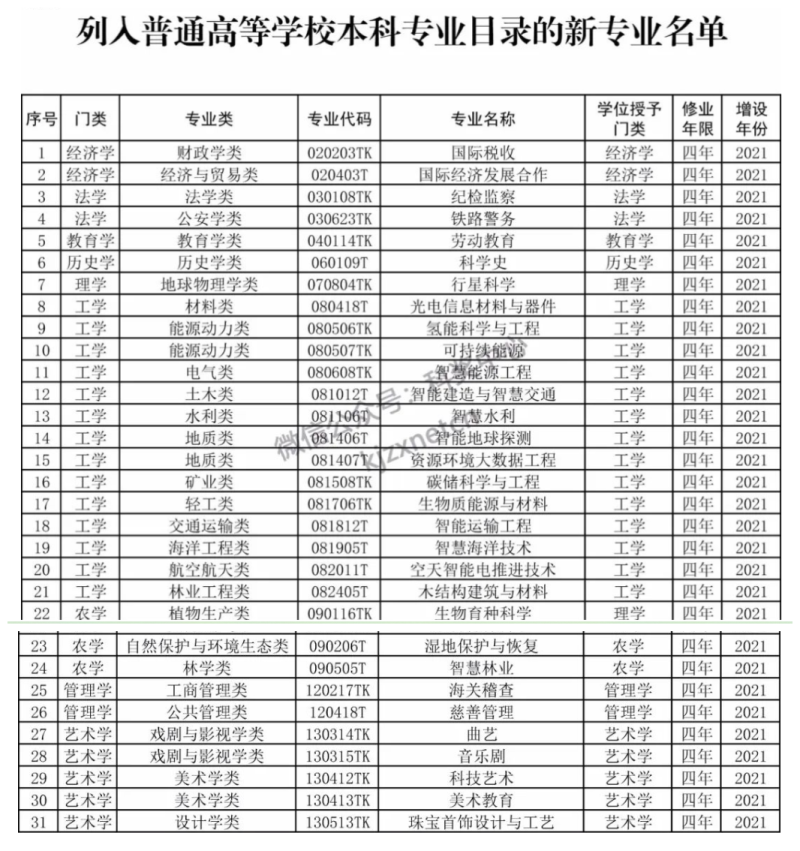 此次教育部還公布了31種新列入《普通高等學校本科專業目錄》,涵蓋經濟學、農學、工學、藝術學等9大門類,在本科專業設置調整工作中,支持高校主動服務國家戰略、區域經濟社會和產業發展需要,設置符合辦學定位和辦學特色的專業;引導高校用好學科交叉融合的“催化劑”,推進新工科、新醫科、新農科、新文科建設,增設文理、理工、醫工等交叉融合的新專業。