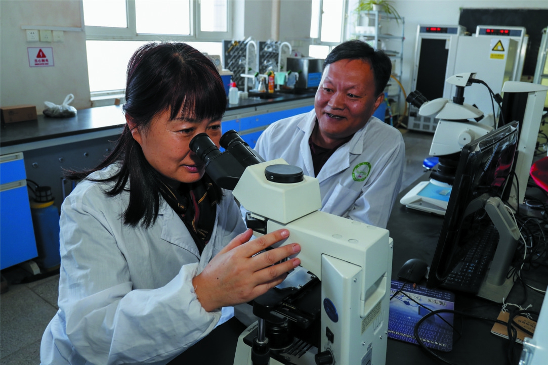 12月14日,王蘭(左)與馮宏祖查看實驗結果。夫婦倆均是塔里木大學植物科學學院教授,從教26年來,培養了近50名碩士生、博士生。
