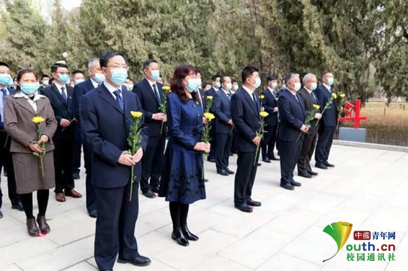 圖為校領導及師生代表獻花。中國青年網通訊員余明星 拍攝
