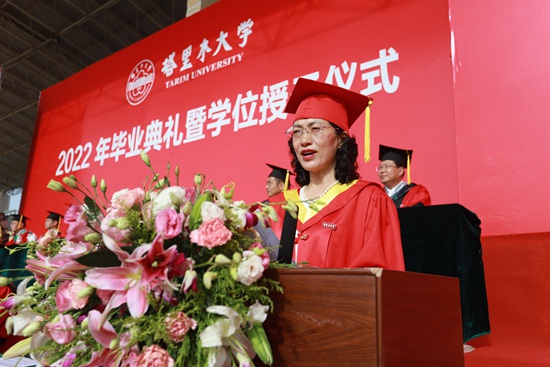 人民網北京6月15日電 6月14日,塔里木大學2022年畢業典禮暨學位授予儀式舉行。典禮上,黨委副書記、校長張愛萍向2022屆畢業生致以誠摯的祝福,對他們四年來成長和收獲表示熱烈的祝賀,向辛勤耕耘的老師、關心學校發展的家長和社會各界表示衷心的感謝。