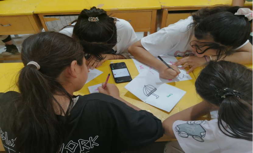為團(tuán)隊(duì)成員員在和孩子們交流畫畫的靈感。