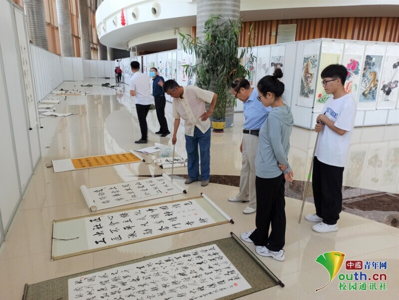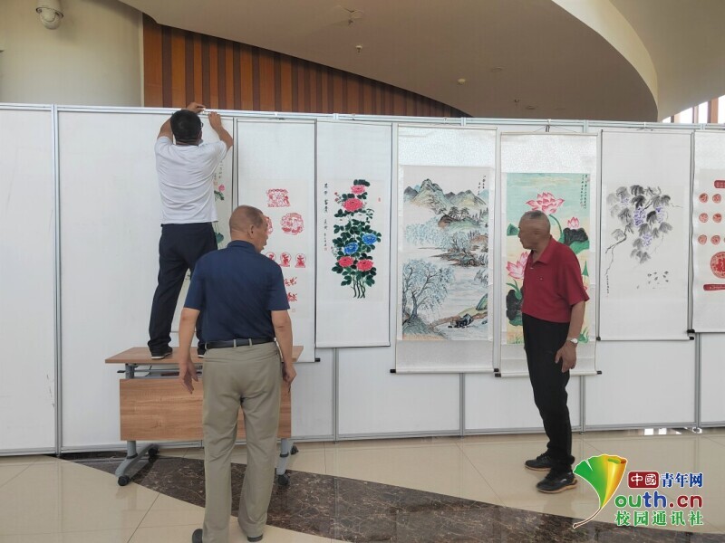 圖為志愿者布置國畫作品。中國青年網通訊員 郭樂樂 攝