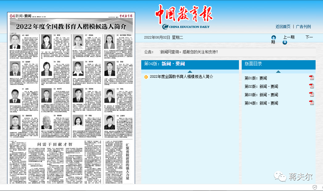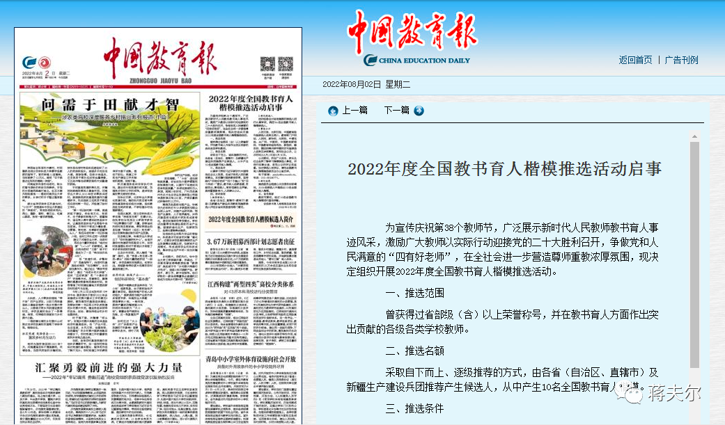 本報訊(記者 蔣夫爾)為宣傳慶祝第38個教師節,廣泛展示新時代人民教師教書育人事跡風采,激勵廣大教師以實際行動迎接黨的二十大勝利召開,爭做黨和人民滿意的“四有好老師”,在全社會進一步營造尊師重教濃厚氛圍, 全國教書育人楷模推選委員會決定組織開展2022年度全國教書育人楷模推選活動?;顒咏M委會對各地推薦的候選人進行認真審核,確定64名全國教書育人楷模候選人。新疆4位教師入選2022年度全國教書育人楷模候選人名單。