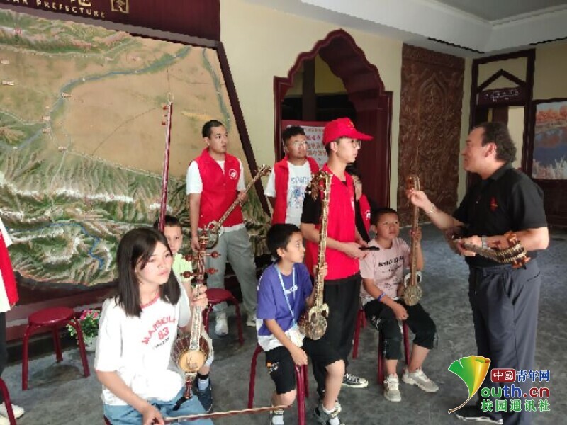 ?圖為民族樂器課上喀什地區文化館老師指導實踐團隊。中國青年網通訊員 張耀輝 攝??