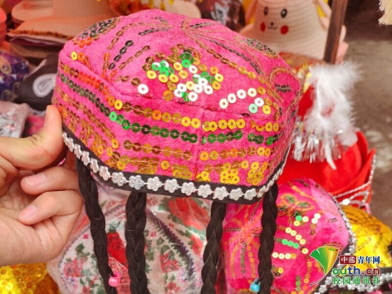 ??圖為實踐團隊調研手工藝品花帽,戴帽不僅具有防寒或防暑的功能,更重要的是作為生活禮儀中的需要,社交、探親、訪友以及節日聚會等場合均會佩帶。中國青年網通訊員 張耀輝 攝