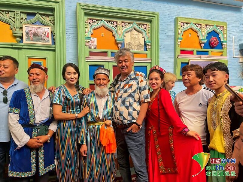 ??圖為麥西來甫舞蹈結束后實踐團隊為表演者拍照紀念,了解到不管何種“麥西來甫”沒有演員和觀眾的區分,無論是遠道而來的客人還是東道主自己,人人都是參與者。中國青年網通訊員 吳昊 攝