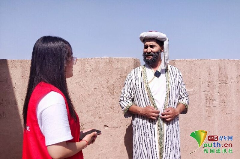 ??圖為實踐團隊采訪阿凡提,了解阿凡提故事。中國青年網通訊員 張耀輝 攝???