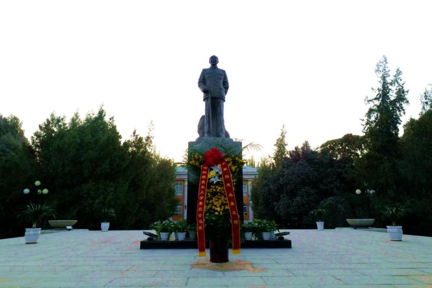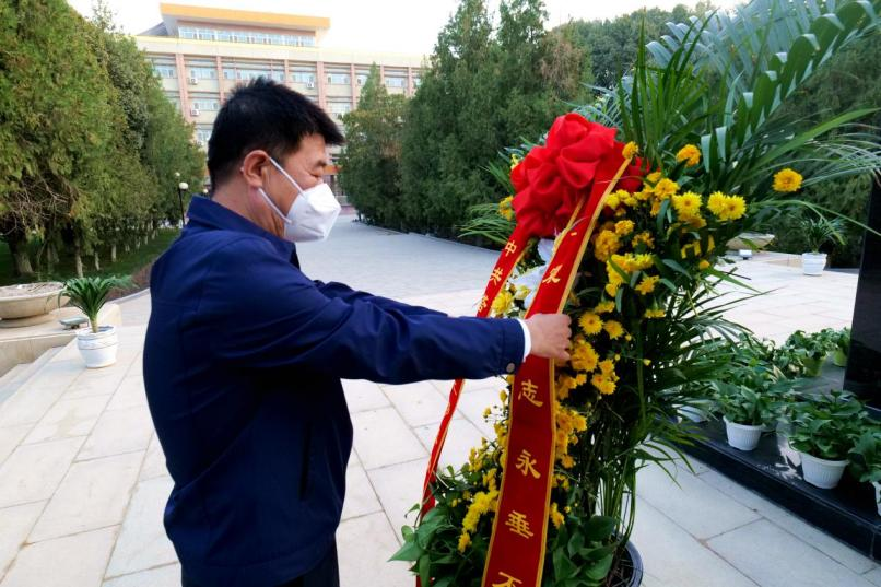 英雄不朽,精神永存。胡楊蒼翠、翠柏頷首。王震將軍銅像,巍然屹立在紅色文化廣場中央,基座周圍花壇上鑲嵌著白菊、百合、黃菊等鮮花組成的花環(huán),寄托著全體塔大黨員干部和師生員工對革命先輩的無限追思。
