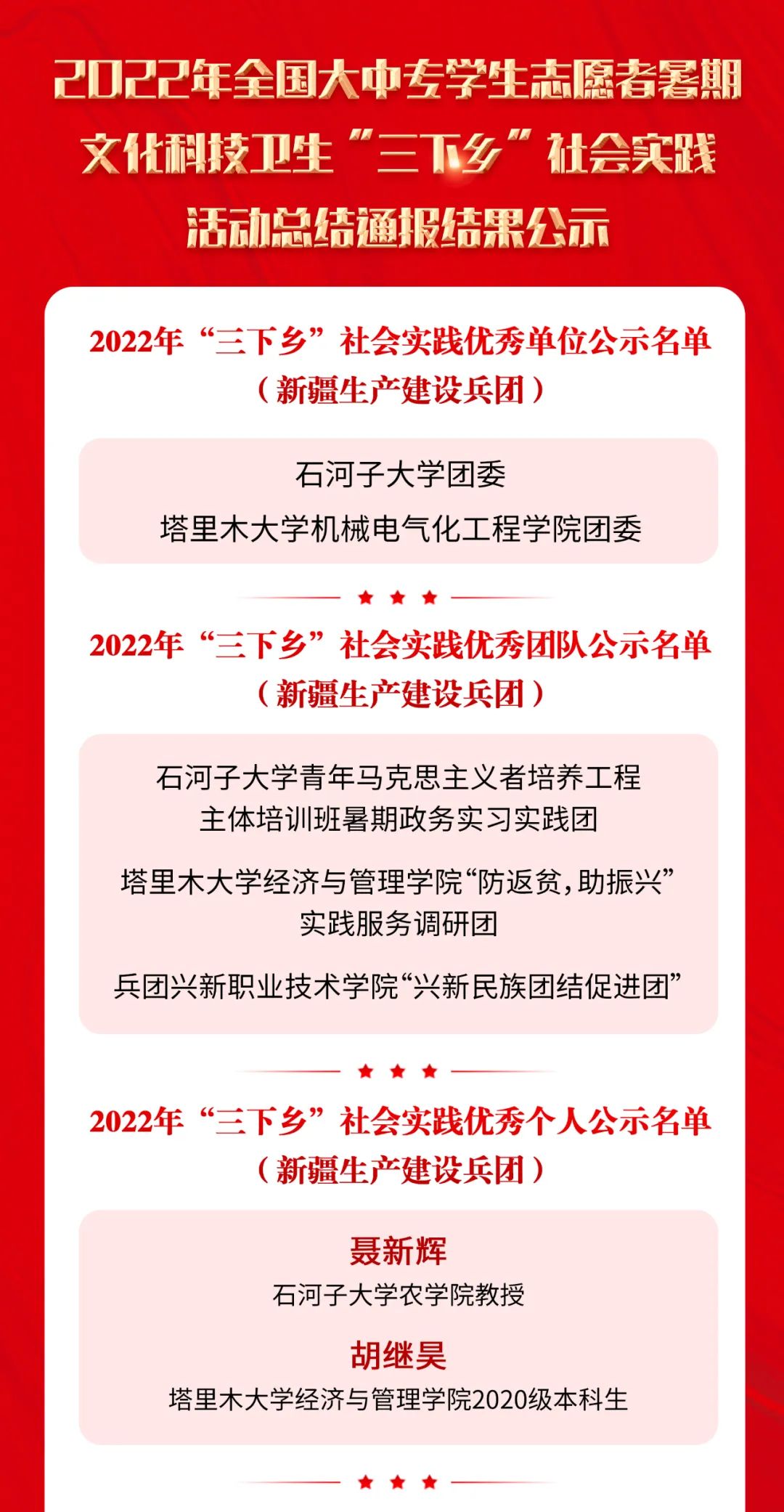 為深入總結交流經驗、選樹典型宣傳、推動引領示范、激勵廣泛參與、發揮育人實效,現通報表揚一批在2022年“三下鄉”社會實踐活動中表現突出的優秀集體、個人和項目,并通過新媒體平臺廣泛進行典型事跡做法宣傳。經基層申報、省級團委審核推薦、組織評議等環節,最終確定290個“三下鄉”社會實踐優秀單位、379個“三下鄉”社會實踐優秀團隊、198名“三下鄉”社會實踐優秀個人、58個“三下鄉”社會實踐優秀品牌項目。這些典型單位、團隊、個人、項目的優秀材料將于10月中旬起在創青春新媒體平臺逐步推出供學習交流。