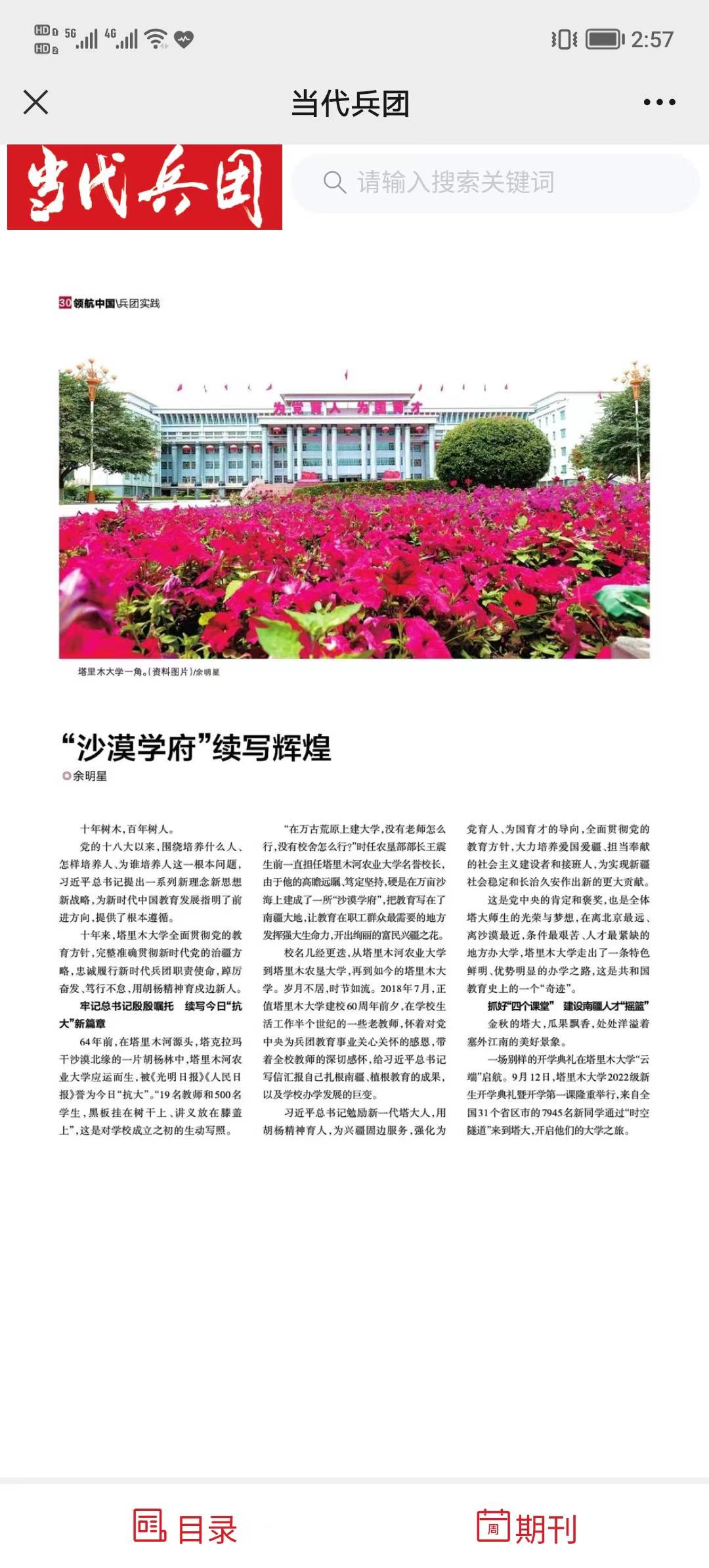 64年前,在塔里木河源頭,塔克拉瑪干沙漠北緣的一片胡楊林中,塔里木河農業大學應運而生,被《光明日報》《人民日報》譽為今日“抗大”。“19名教師和500名學生,黑板掛在樹干上、講義放在膝蓋上”,這是對學校成立之初的生動寫照。