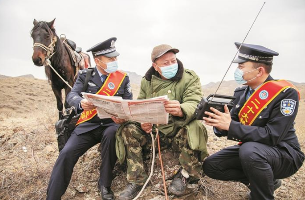 10月19日,五師八十六團夏爾布河邊境派出所“黨員宣講隊”成員,來到八十六團科克賽爾冬牧場,與牧工一同學習黨的二十大精神。 孫振飛 蘆勝磊 攝
