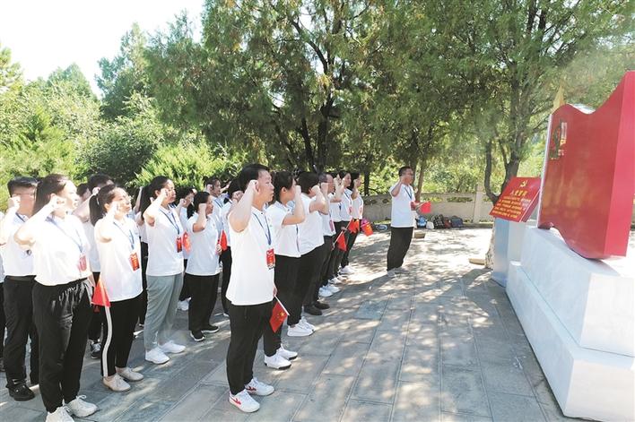塔里木大學“賡續紅色血脈+重走初心之旅”暑期輔導員骨干培訓班學員在延安寶塔山下重溫入黨誓詞(資料圖片)。 塔里木大學 提供