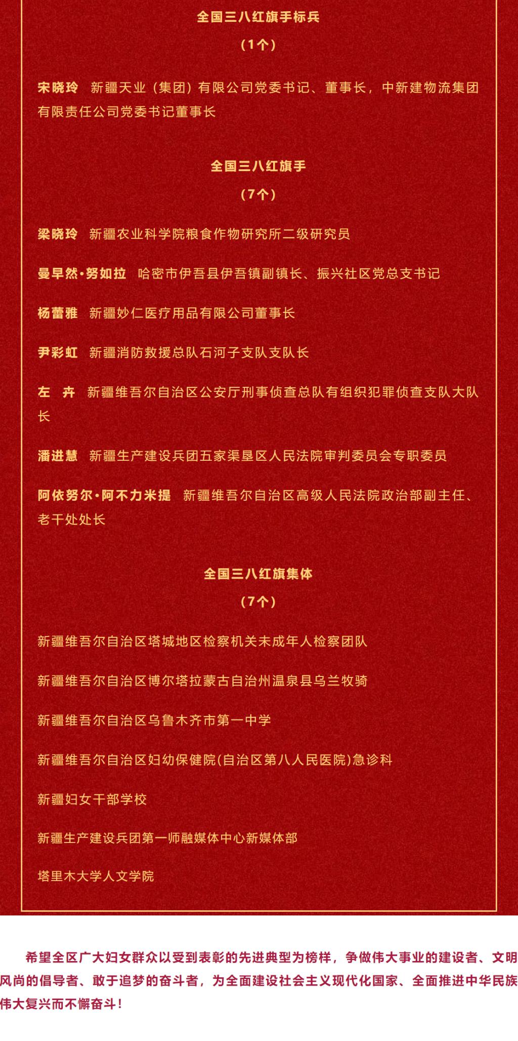 3月1日,全國(guó)婦聯(lián)在京舉行“三八”國(guó)際婦女節(jié)紀(jì)念暨表彰大會(huì),大會(huì)表彰了10名全國(guó)三八紅旗手標(biāo)兵、298名全國(guó)三八紅旗手、199個(gè)全國(guó)三八紅旗集體。自治區(qū)及兵團(tuán)1人榮獲全國(guó)三八紅旗手標(biāo)兵稱號(hào),7人榮獲全國(guó)三八紅旗手稱號(hào),7名集體榮獲全國(guó)三八紅旗集體稱號(hào)。