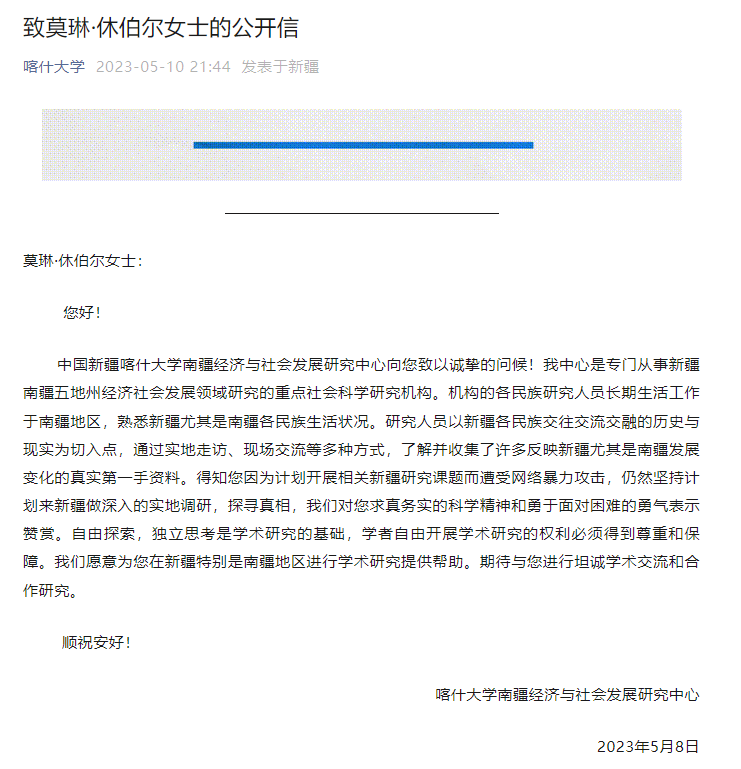 此前,希望了解新疆真實情況的休伯爾在社交媒體宣布將于2024年赴疆,她因此遭到網絡暴力、賬號被封、學術合作受阻等問題。許多人指責她是“假賬號”、“宣傳工具”和“機器人”,甚至向她發出死亡威脅。