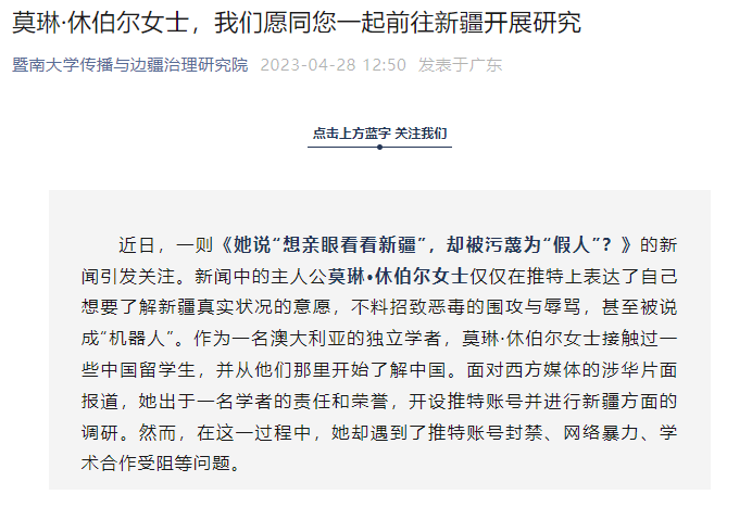 暨南大學傳播與邊疆治理研究院表示,近些年,一些西方國家出于意識形態偏見和地緣政治戰略需要,以人權為借口大肆炒作所謂新疆“種族滅絕”“強迫勞動”等議題。在國際上,一些反華媒體和政客造謠生事,中國學者的正義聲音長期被打壓和忽視,更遑論與國外學者開展合作研究。對于莫琳·休伯爾女士的遭遇,我們感同身受。