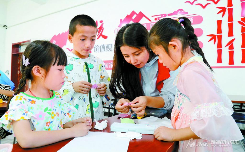 7月4日,志愿者教小學(xué)生做手工折紙。