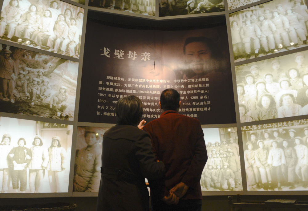 ??游客在新疆兵團軍墾博物館內反映“戈壁母親”的展臺前參觀(資料照片)。新華社記者 趙戈 攝