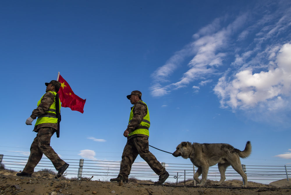 ??兵團十師185團職工馬軍武(右)在巡邏途中(2021年4月9日攝)。新華社記者 胡虎虎 攝