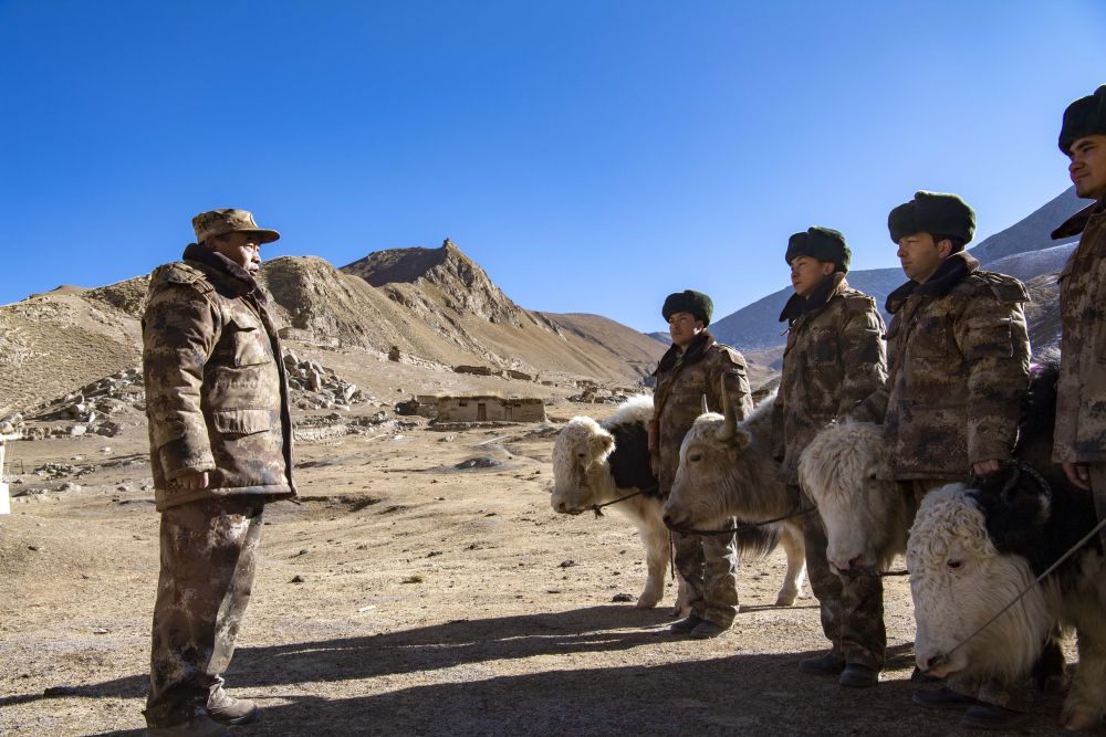 ??巡邊隊員出發前,兵團三師葉城二牧場三連黨支部書記劉前東(左一)叮囑巡邊重點、安全事項(2020年12月25日攝)。新華社記者 胡虎虎 攝