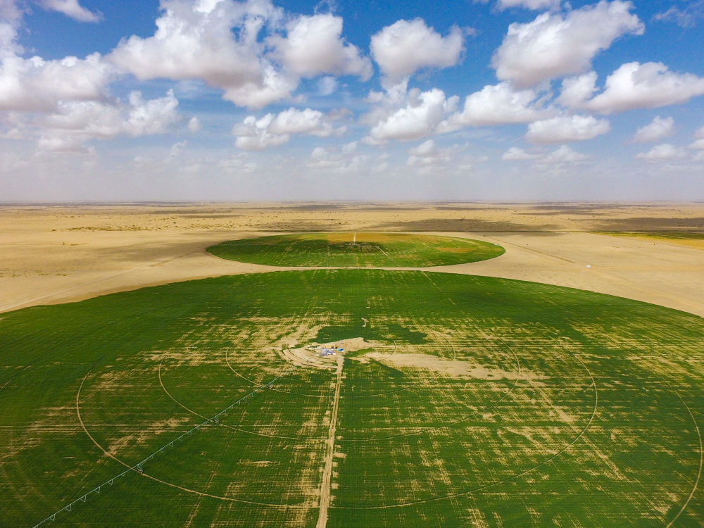 ??這是9月4日在兵團第十四師昆玉市二二四團玉園鎮拍攝的苜蓿飼草種植項目(無人機照片)。