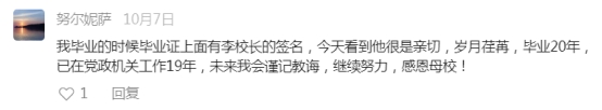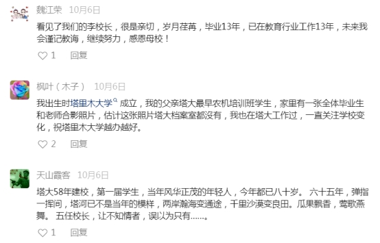 “作為塔大的老校長的后代,看到塔里木大學發展到今天,取得的重大的成績感到非常高興和欣慰。塔里木大學是從沙漠邊邊硬生生建起的高等學府,這是塔里木大學幾代教職員工的艱苦努力和無私奉獻所取得的成績,他們這種為黨的事業奮斗的精神值得我們學習!”