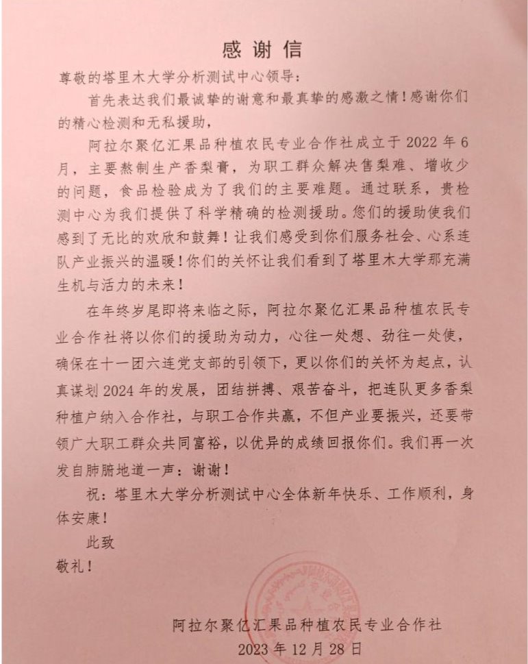 1月2日,我校收到阿拉爾聚億匯果品種植農民專業合作社送來的感謝信。信中對我校分析測試中心為阿拉爾聚億匯果品種植農民專業合作社提供的食品檢測援助表示感謝。