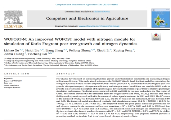 近日,塔里木大學信息工程學院白鐵成教授團隊在《Computers and Electronics in Agriculture》(SCI,中科院一區TOP期刊,JCR農業綜合學科排名第一,IF:8.3) 在線發表了題為“WOFOST-N: An improved WOFOST model with nitrogen module for simulation of Korla Fragrant pear tree growth and nitrogen dynamics”的研究論文。該研究針對現有果樹氮素運移模擬研究領域的空白和缺陷,集成氮素運移理論到WOFOST模型,實現了梨樹生長、氮素運移和氮效應的模擬,使果園精準氮肥管理從經驗統計分析提升到定量化、機理性描述水平。農業工程專業碩士研究生徐歷超為論文第一作者,白鐵成教授為通訊作者。該研究得到國家自然科學基金、兵團科技項目和塔里木綠洲農業教育部重點實驗室的支持。