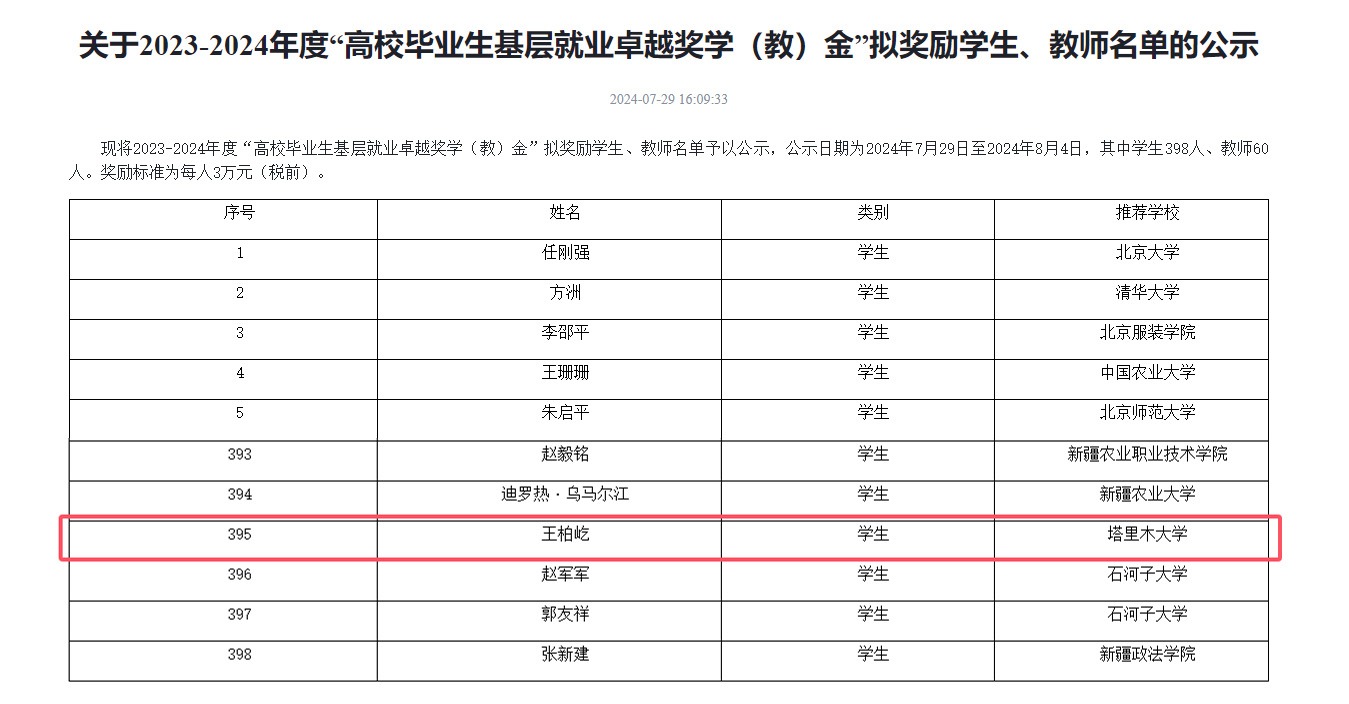 近日,教育部公布了2023-2024年度全國“高校畢業生基層就業卓越獎學(教)金”獲獎人選名單,我校2017屆農業資源與環境專業(本科)畢業生王柏屹入選。
