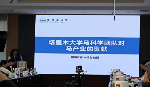 會議期間,格明古麗·木哈臺作了《塔里木大學馬科學團隊對馬產業的貢獻》為題的學術報告,從塔里木大學在馬業科學教育和研究方面的獨特優勢、所在科研團隊長期致力于馬產業領域取得的研究成果,加強馬產業校企合作、對外交流合作經歷,三方面詳細介紹了馬產業研究在塔里木大學的具體實踐。