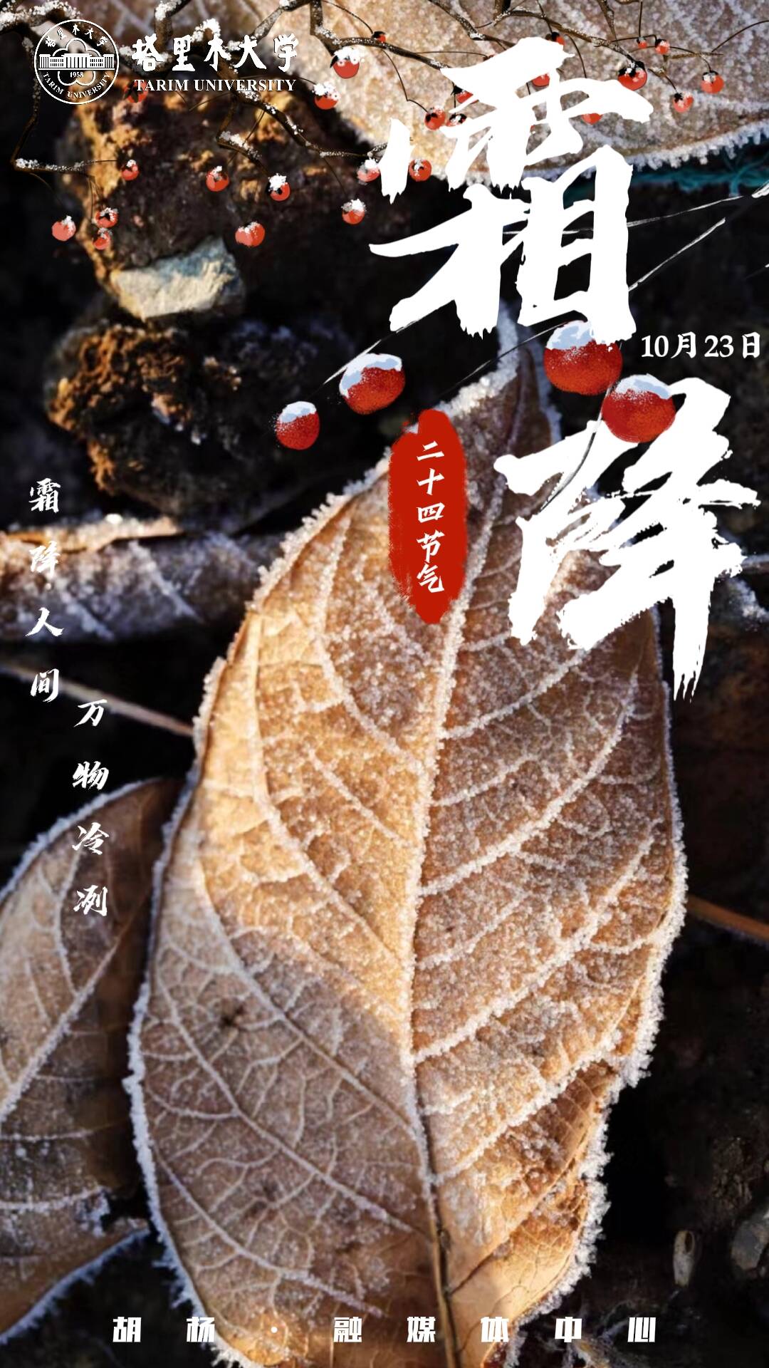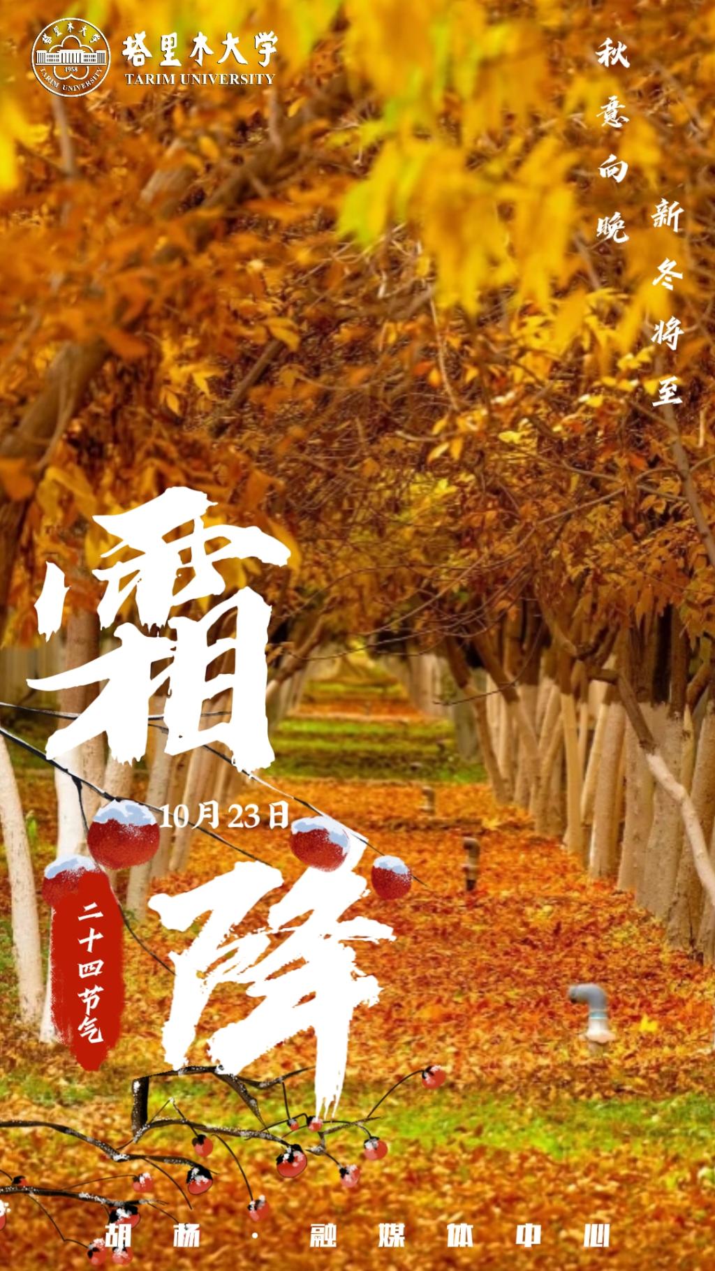 霜降,二十四節氣之一,每年公歷10月23日左右,霜降節氣含有天氣漸冷、初霜出現的意思,是秋季的最后一個節氣,也意味著冬天的開始。霜降時節,塔大浸染金色風韻,迎來秋收冬藏,校園處處顯露大自然賦予的神奇色彩。