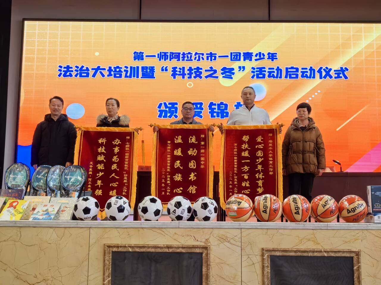 塔里木大學、奎屯航空運動協會、一團中學為青少年們捐贈了籃球、足球、乒乓球等體育用品、圖書繪本,以及航模等科普器材。工作隊向支持單位贈送錦旗表達感謝。