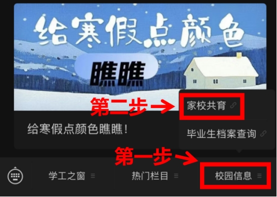 第二步:點擊公眾號下方的“校園信息”選項,在彈出的菜單中選擇“家校共育”模塊。