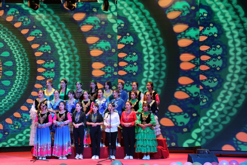 第二篇章為胡楊情,少數民族代表隊身著精美服裝,優美的《沙棗樹》和《塔里木河》,贊揚了沙棗樹不畏艱難困阻和塔里木河無私哺育一代代兵團人的兵團精神和胡楊精神。