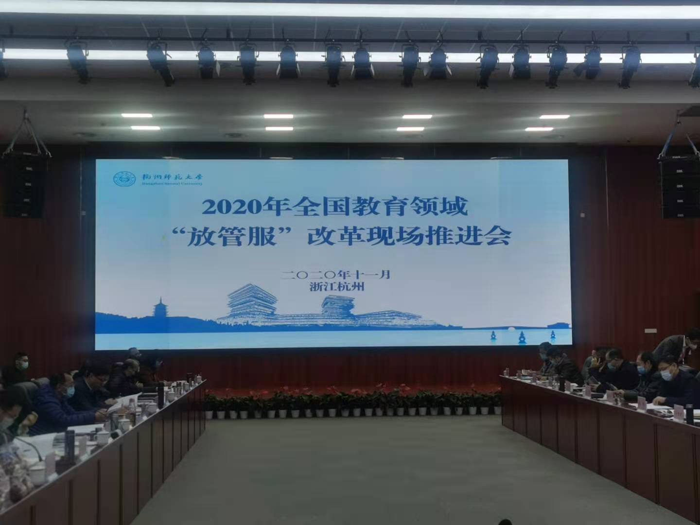 本次會議由教育部政策法規司主辦、杭州師范大學承辦。教育部政策法規司副司長楊志剛、浙江省教育廳副廳長陳峰、杭州師范大學黨委書記陳春雷、全國各省市區教育廳(教委)負責“放管服”工作的同志參加會議。