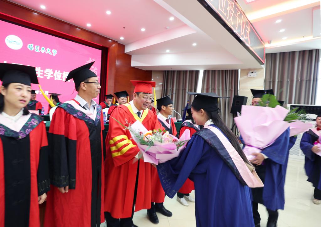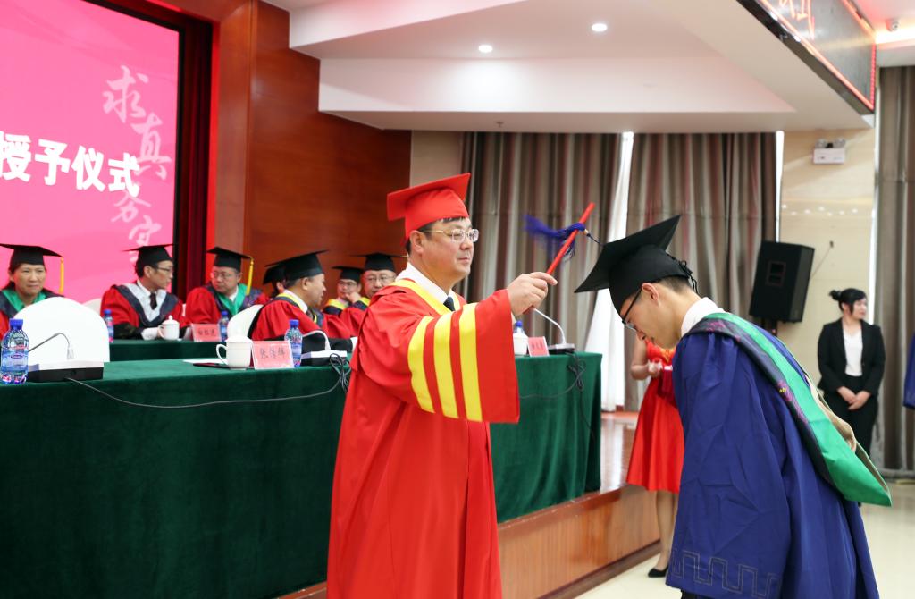 儀式上,黨委副書記、校長、校學位評定委員會主席張傳輝教授授予學位。同學們依次上臺,張傳輝為碩士研究生一一撥穗,授予學位,定格那莊嚴的時刻。握手、撥蘇、合影,萬里送行舟,道不完求學數載路,遠送從此別,說不盡學師生情。這莊嚴儀式凝聚為畢業生們對塔大印記的濃重一筆,也成為碩士生涯的完滿句號。