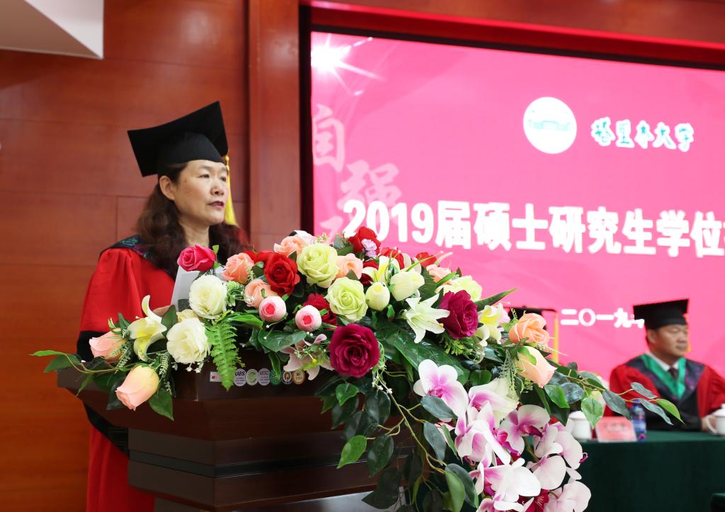 張利莉主持儀式,希望畢業研究生牢記希望和囑托,要抓住夢的翅膀,乘風破浪、奮然前行,朝著精彩的未來啟航。要做一個有遠大理想抱負的人,要做一個有深厚家國情懷的人,要做一個有偉大創造力的人,在實現中華民族偉大復興中國夢的宏偉征程中放飛青春夢想。