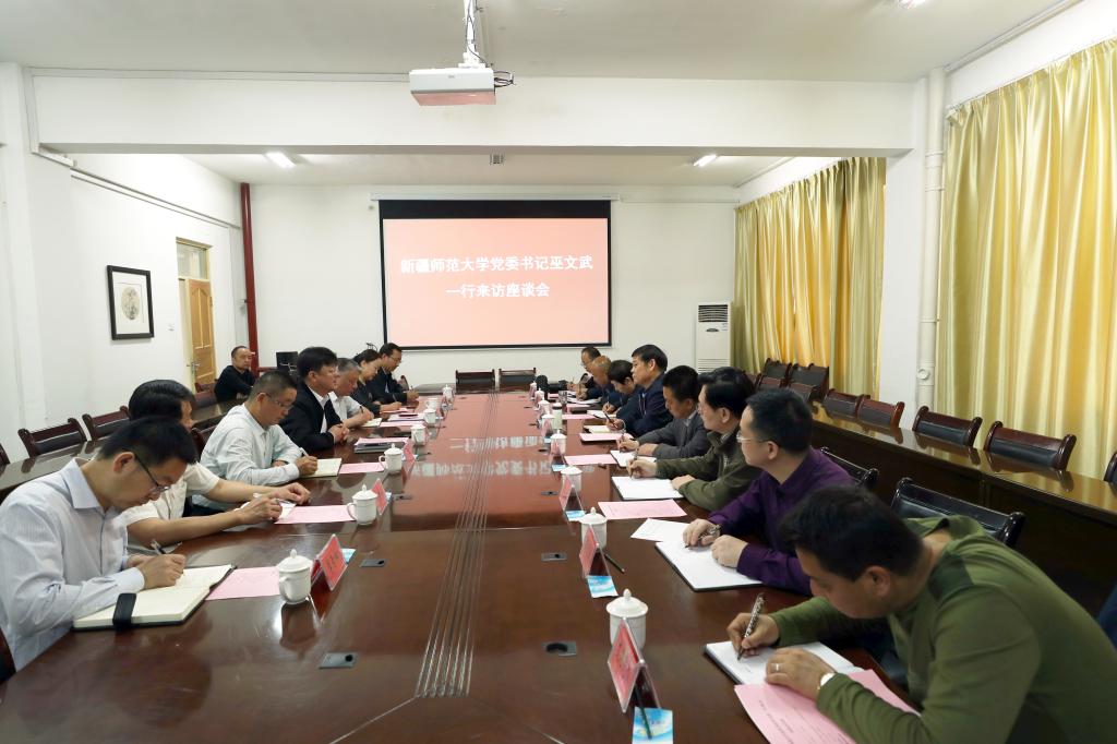 4月14日,新疆師范大學黨委書記巫文武,帶領該校黨委常委、紀委書記王志勇,黨委常委、副校長孫秀玲,黨委常委、宣傳部部長高靖等來校考察訪問,受到我校黨委副書記、校長張傳輝,黨委副書記、紀委書記單洪山,黨委常委、副校長曲義勇等領導熱情接待。雙方在行政樓317室舉行座談會。