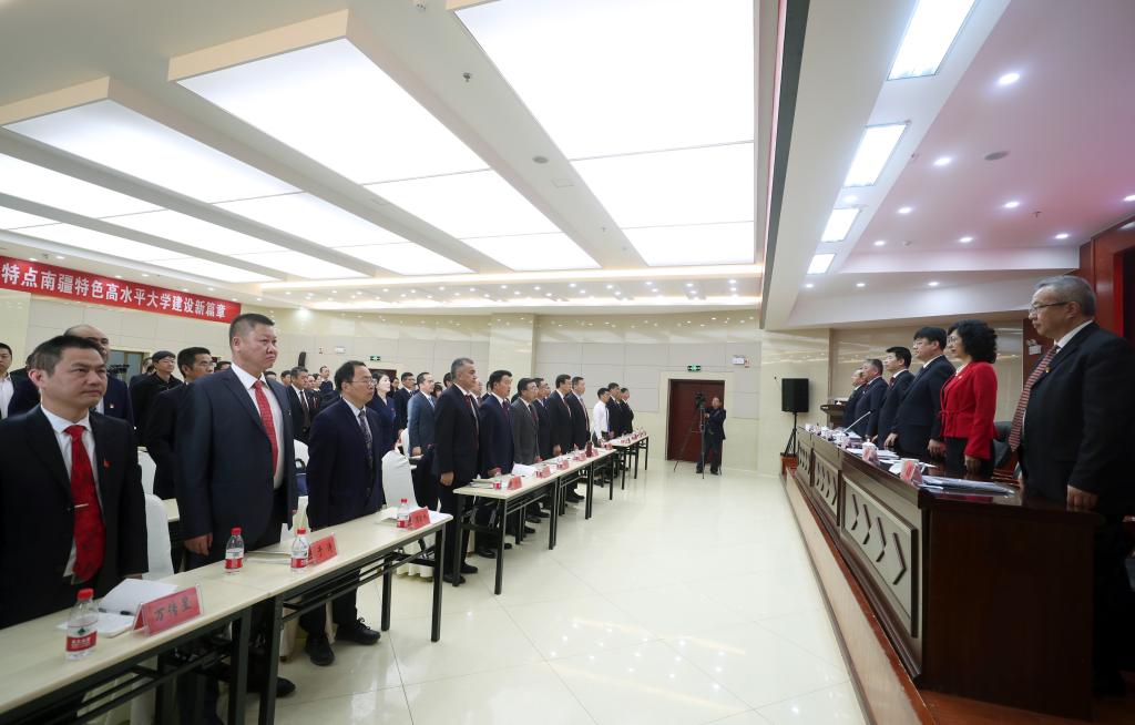 黨委書記趙光輝,黨委副書記、校長張傳輝,黨委副書記、紀委書記單洪山,黨委常委、副校長張愛萍、盧光志、曲義勇,以及黨委委員、列席人員、特邀人員80余人參加大會。大會由張傳輝主持,在南疆雙語培訓中心二樓報告廳舉行。