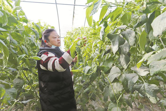 11月20日,民航新村村民王春枝在蔬菜大棚里察看蔬菜長勢。 兵團日報駐十四師記者站 劉秋月 攝