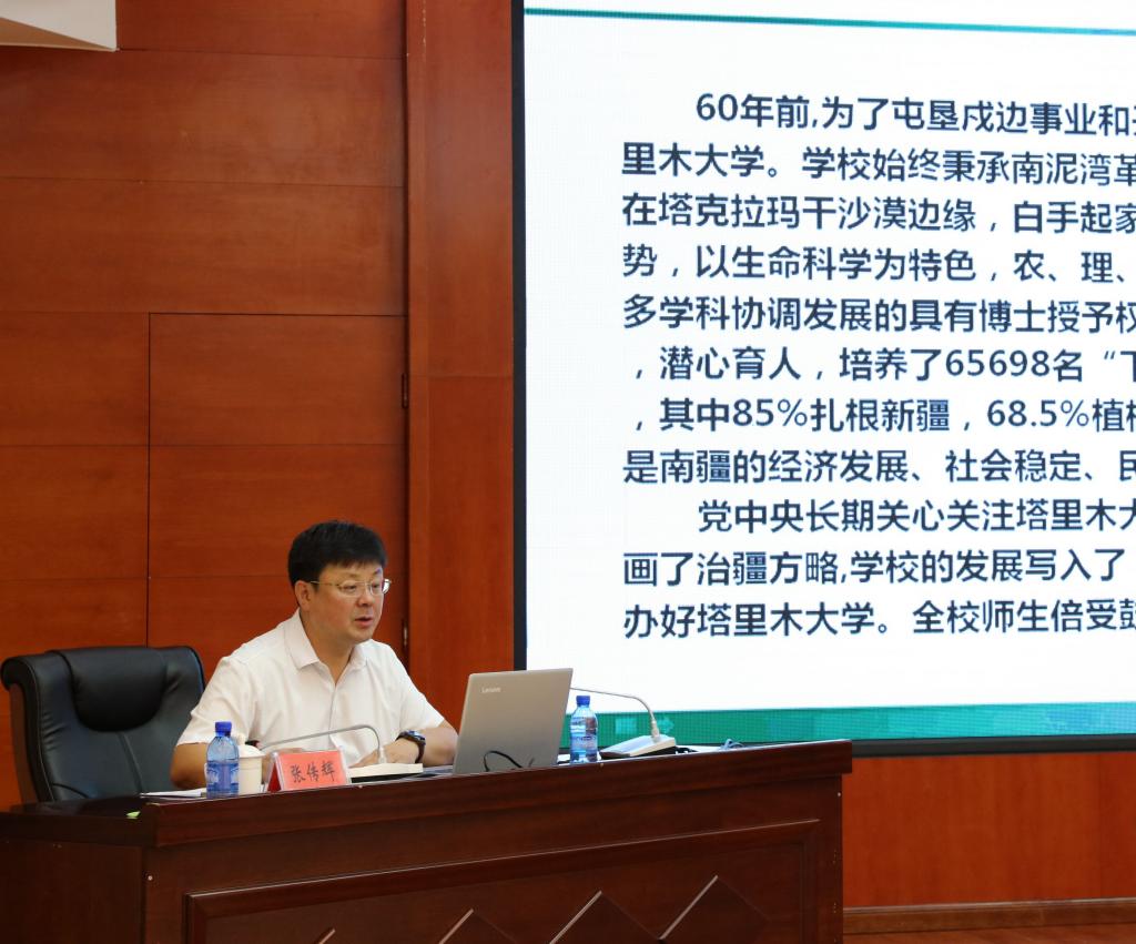 7月20日,廣東省教育廳新疆家訪團39人來校調研。20日下午,塔里木大學黨委副書記、校長張傳輝,在南疆雙語培訓中心二樓報告廳,為廣東省教育廳新疆家訪團,作了《用胡楊精神育人,為興疆固邊服務》的專題報告。