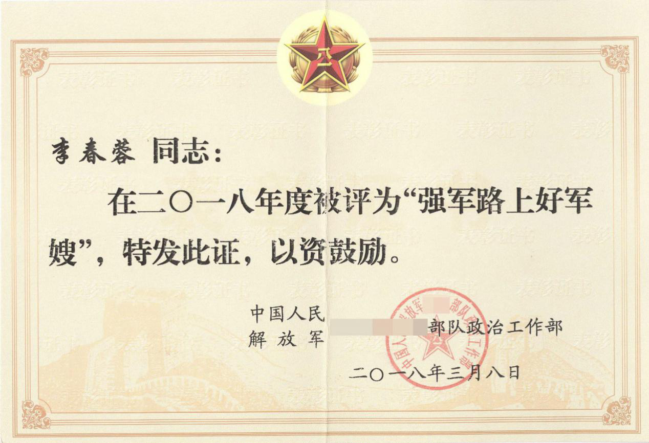 多年來,她獨自和公公婆婆、兩個孩子在邊疆工作、生活,2013年婆婆體檢檢查出細胞病變,手術和術后照顧都是她獨自一人承擔,直到活檢結果排除癌癥才告訴老人實情。公婆生病,檢查輸液、端水遞藥,她都守護在身旁。正是李春蓉獨自撐起家庭中老人、子女的照顧和撫養,祖孫三代相處和諧融洽,愛人費曉華同志在部隊才能全心投入保家衛國事業,練就敢打硬拼的作風,圓滿完成各項任務,三次榮立“三等功”,兩次被評為“優秀基層干部”,還獲得國防服役章、2008年512抗震紀念章。