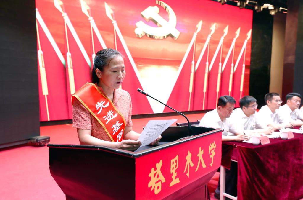 “2003年1月14日,我站在鮮紅的黨旗下宣誓,那時我心中無比激動和自豪。從此堅定了我的理想信念,立志要好好學習,報效祖國。”優秀共產黨員教師代表動科院教師聶竹蘭同志發言,以赤然的丹心向偉大的黨致以最崇高的敬意和虔誠的祝福,感謝黨對她多年來成長發展的關愛、教育和培養。她表示要感黨恩、聽黨話、跟黨走,牢記總書記的深切期盼和殷殷囑托,繼承老一輩兵團人、塔大人的優良傳統和作風,爭做“四有好老師”和“五個引路人”,堅持用胡楊精神育人、為興疆固邊服務,努力培養愛國愛疆、擔當奉獻的新時代戍邊人。