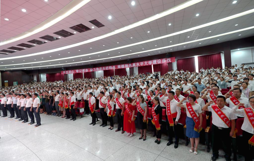 黨委書記趙光輝同志,黨委副書記、校長張傳輝同志,黨委副書記、紀委書記單洪山同志,離退休老黨員、老干部代表,各基層黨委總支(書記)出席大會。全體處級領導干部、全體師生黨員等1000余人參加大會。張傳輝同志主持大會。