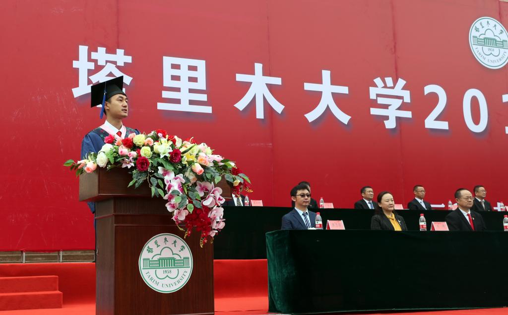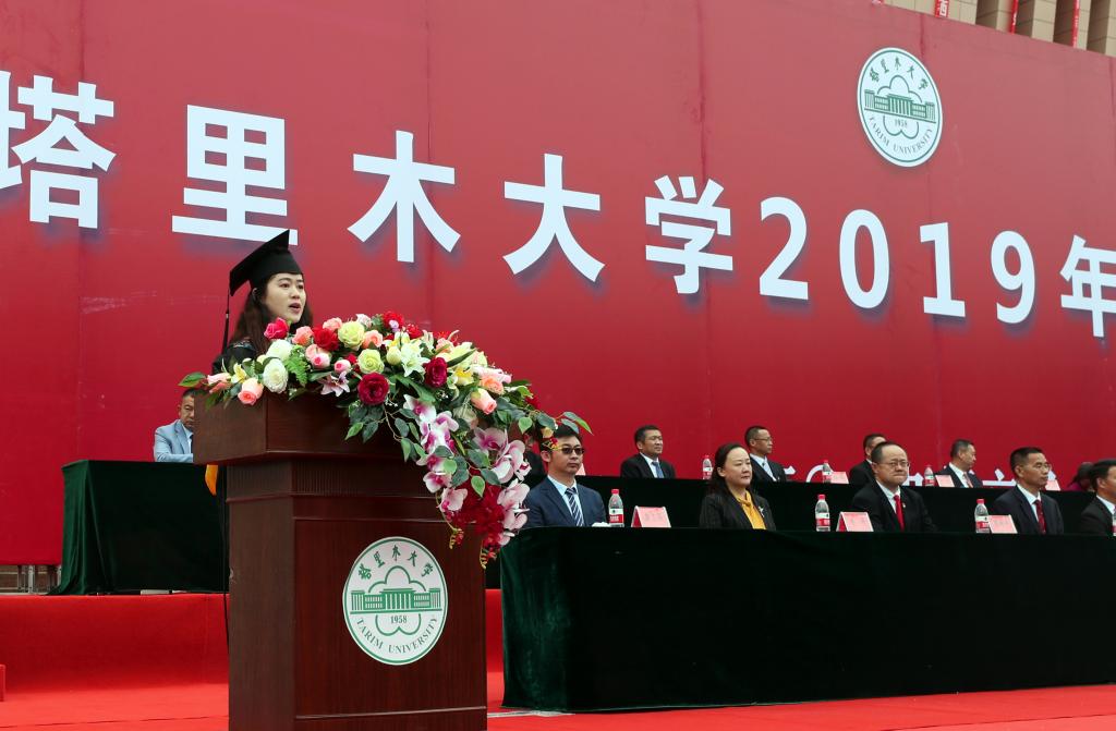 “幾年前的金秋,你們懷揣著父母的期望和企盼,充滿著興奮、未知與期待,來到塔里木大學這座‘沙漠明珠’學府,在‘自強不息,求真務實’校訓的指引下,在教師們‘嚴謹治學、精心育人’治學作風的悉心培養下,收獲了學識,歷練了品行,成熟了心智,開拓了視野,今天你們將帶著母校的傳承和情懷,開始新的征程。”教師代表植物科學學院吳翠云教授發言,告誡全體畢業生,要做一個快樂的充滿正能量的人;要規劃好自己的人生,不斷地學習和奮進;要誠實守信,有良知;要學會感恩,勿忘母校。希望同學們擁有一個樂觀的心態、健康的體魄、滿意的工作、幸福的家庭。